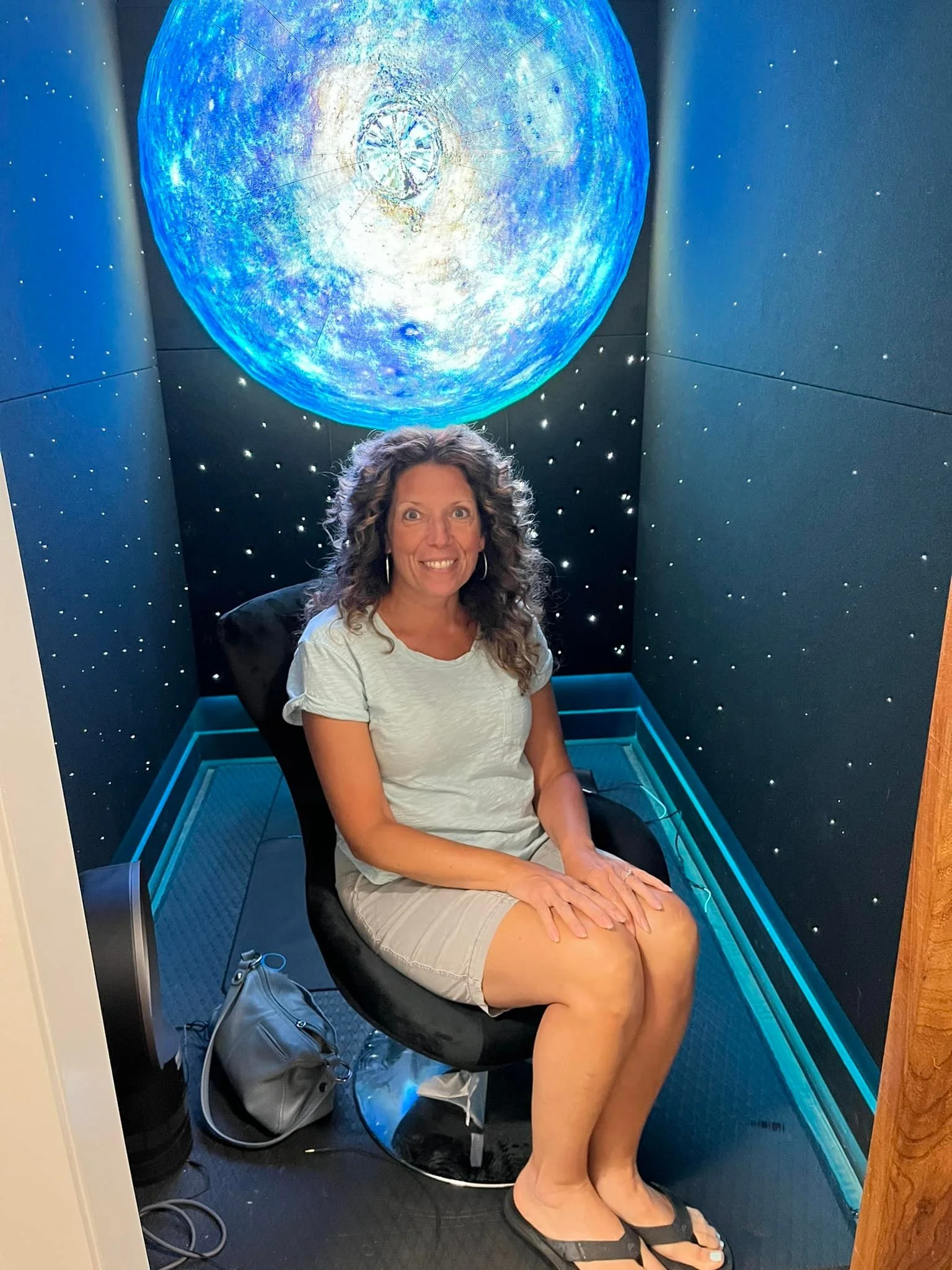Experience the ONE OF A KIND private meditation space. Our custom-designed projection sphere displays images of the earth, while a PEMF mat assists you in grounding. You have the option of adding music, using a guided meditation or silence.